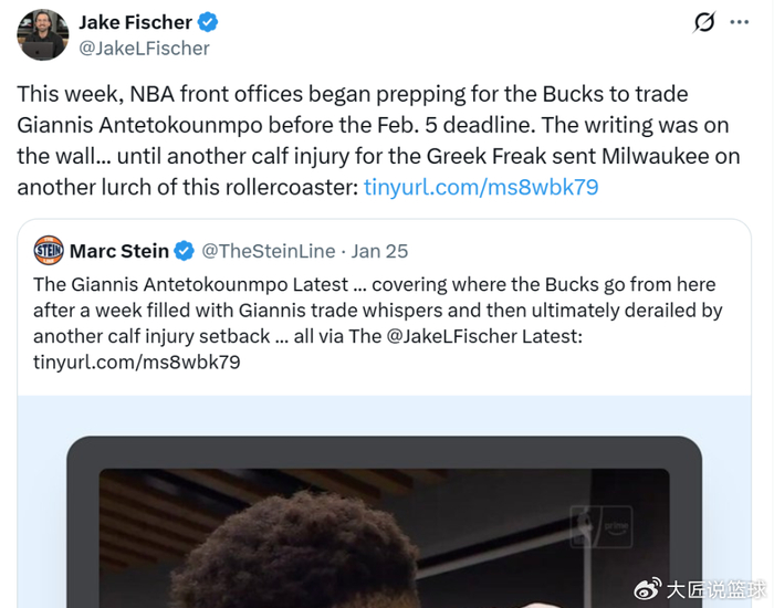 消息来自于美媒《The Stein Line》名记Jake Fischer对于字母哥潜在价值的长文分析。