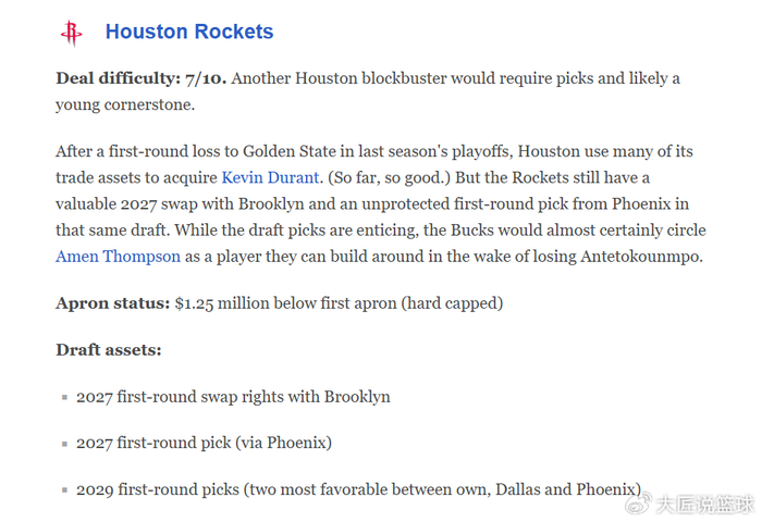 在8换1引进杜兰特后,火箭队依旧手握海量筹码,完全有能力追求字母哥。